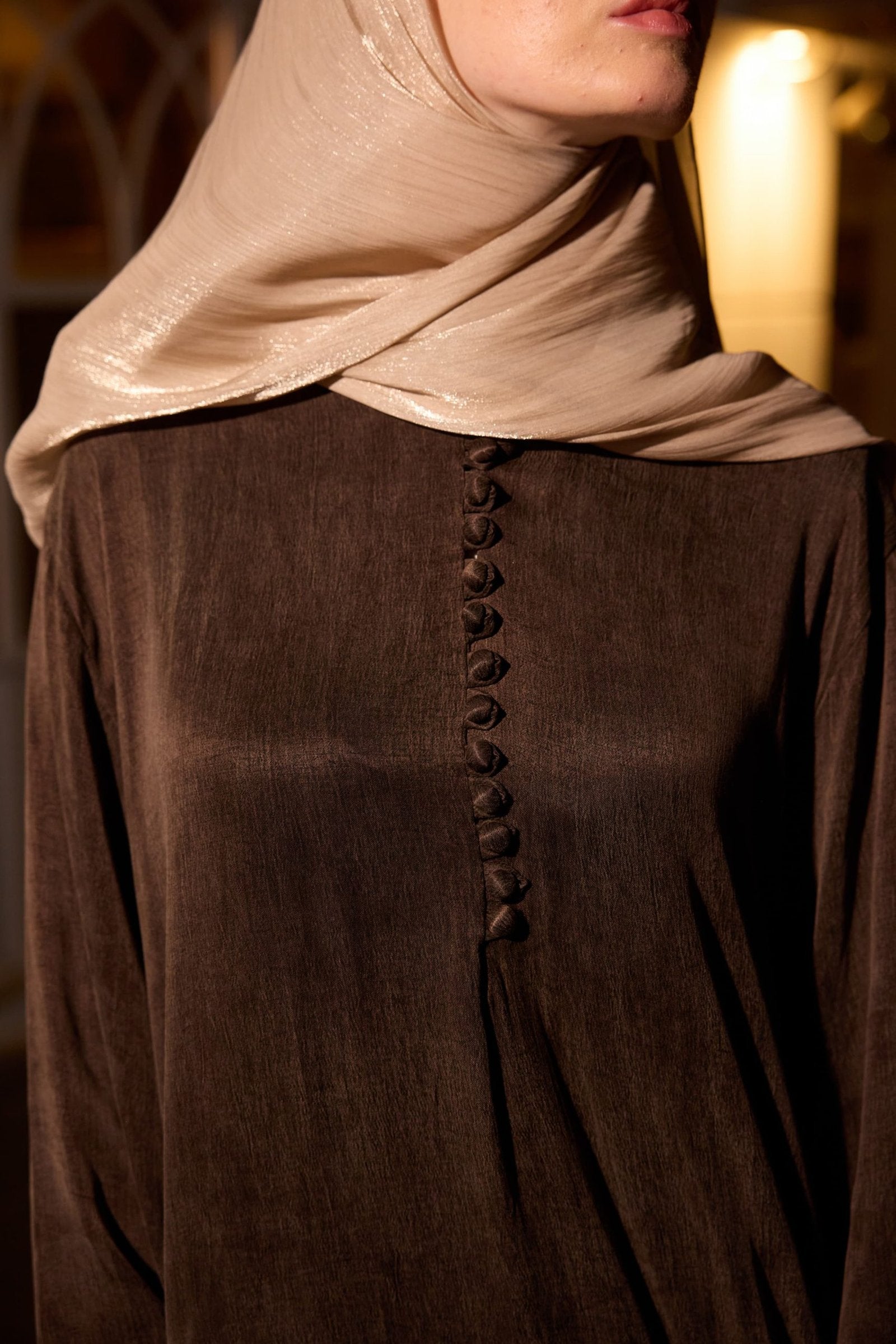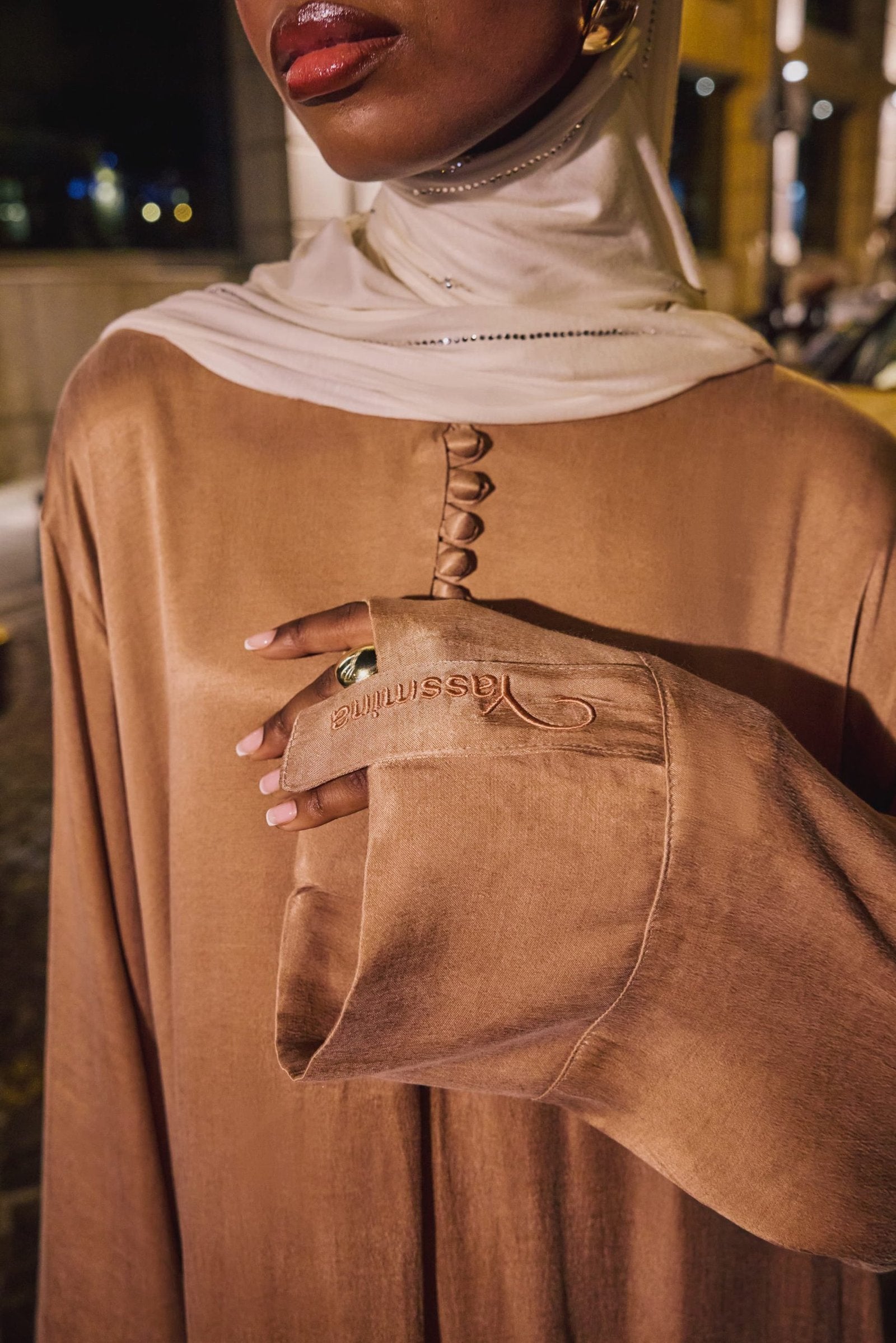 Yakadan göğse kadar çok sayıda düğmeyle emzirme dostu. - Kol bileğinde abaya ile uyumlu renklere sahip sıkı işlenmiş logo.