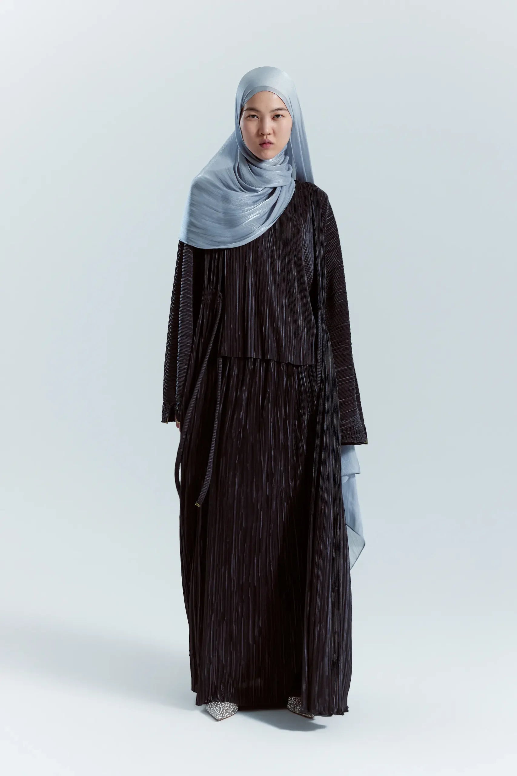 Kore Saten 3 Parça Plisse Abaya Takımı