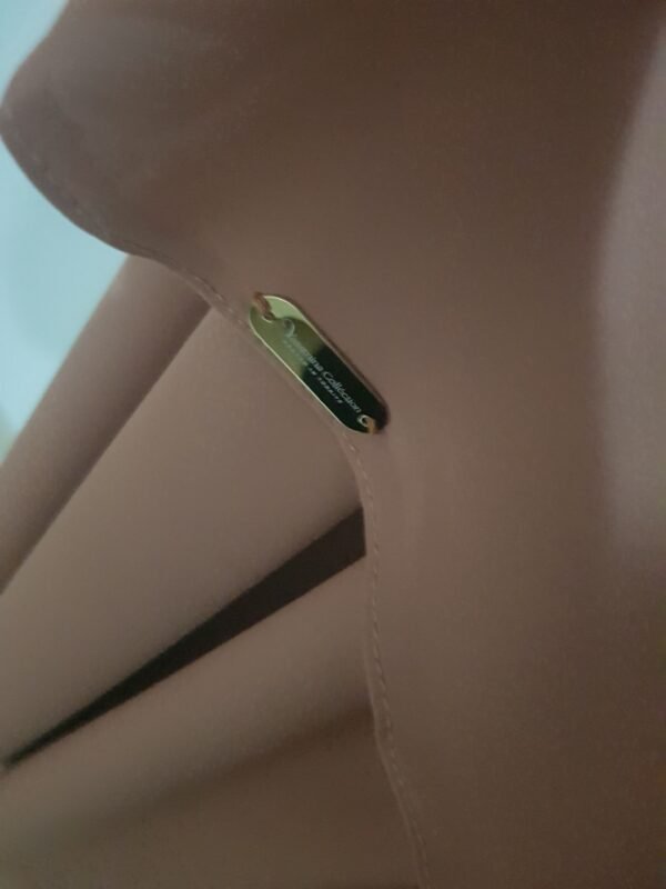 - Minimalist sleeves with a sleek cut, gracefully flowing from the shoulder to a delicate, refined cuff.